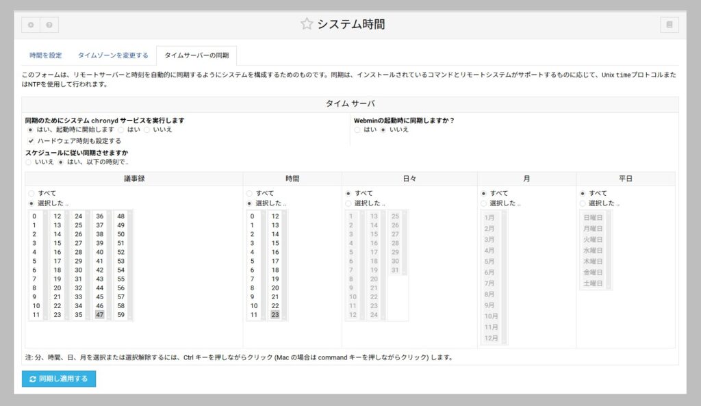 「ハードウェア」⇒「システム時間」⇒「タイムサーバーの同期」で設定する。
